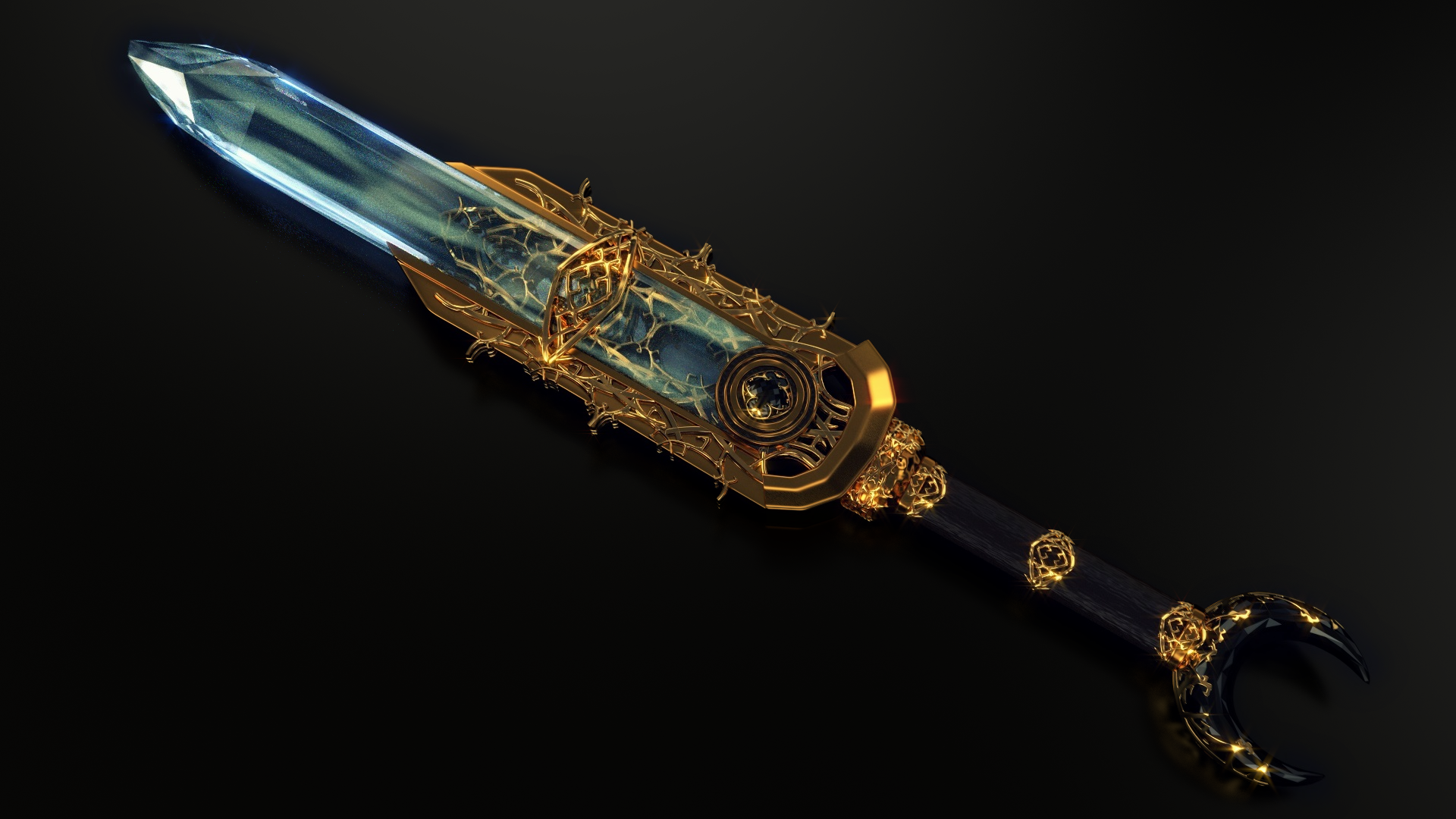 У орудия была прямая черная ручка, украшенная по всей длине тремя золотыми кольцами, в навершии разветвлявшаяся в пару коротких загнутых дуг, на манер бычьих рогов. От рукояти вверх шел двузубый держатель, вдоль которого тянулись силовые линии, опоясанный кольцом посередине. В нем же был закреплен голубой кристалл, ограненный в виде заостренного многогранника.