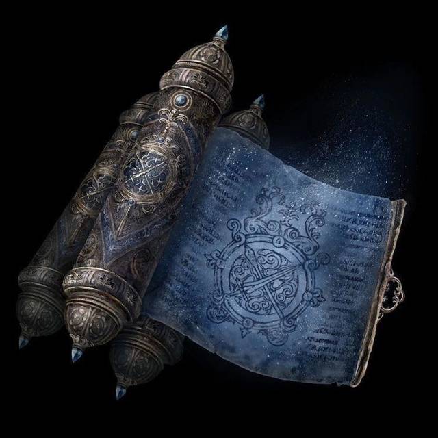 Прямо напротив саркофага располагался невысокий, ничем не примечательный, постамент. На нем лежал богато украшенный металлический футляр для свитка, покрытый небесного цвета камнями. От чего-то часть свитка осталась вне защиты. На синей ткани был герб и письмена, на неизвестном Тирисфалю языке.