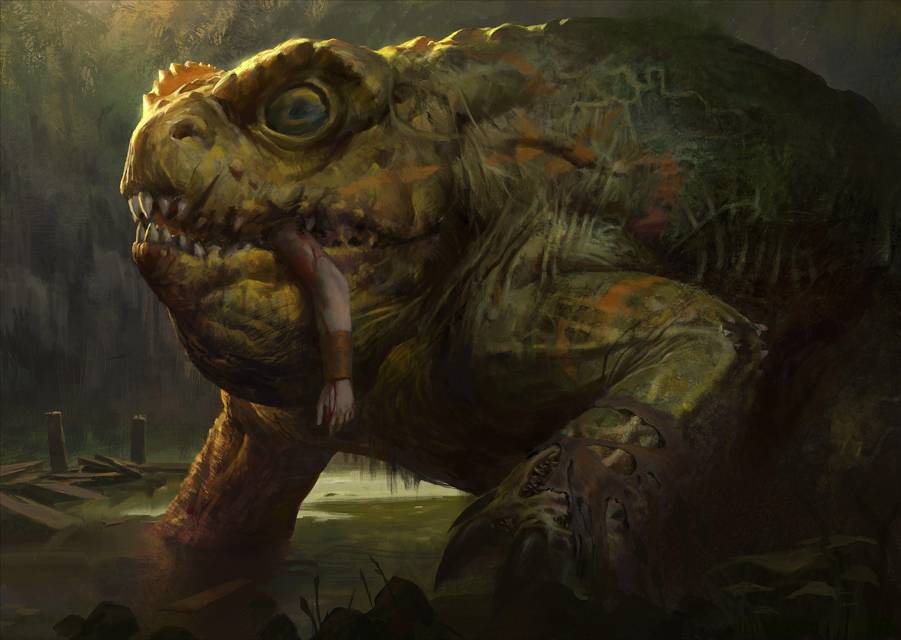Издав глухой, гортанный звук, из толщи стоячей воды, на границе поляны, поднялась здоровенная туша. Жаба переросток достигала почти двух метров в холке. Имела мощные, ребристые гребни над глазами. Такой же, разве что больше, тянулся вдоль позвоночника. Но главное, в ее пасти, от чего-то полной клыков, с легкостью мог уместиться человек.