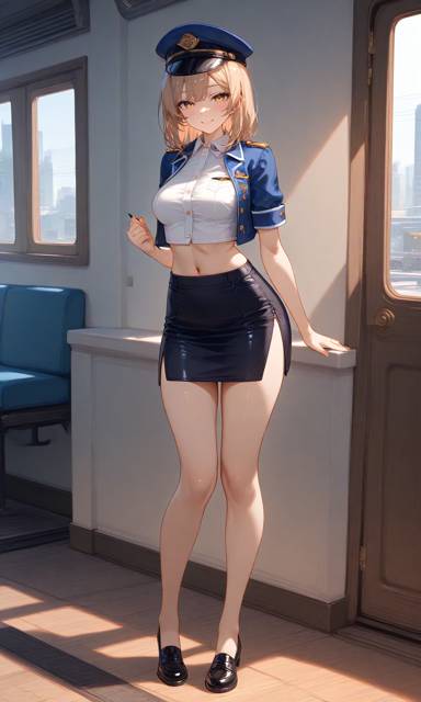Судя по всему, работница одной из транспортных компаний, потому что наряжена в знакомую, но резко опошленную форму железнодорожницы. В ровной юбочке до середины голого бедра, в коротком пиджачке, у которого полностью открыт животик и руки дальше локтей…