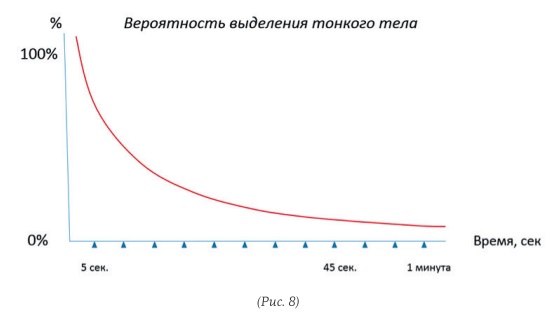 Существует прямая связь между уровнем энергии и вероятностью выхода тонкого тела. Мы можем все прекрасно знать и даже владеть инструментарием, но, если прана не поднимается, ее не хватает, опыт может не случиться. Достаточно любых метаморфоз тонкого тела, главное не входить в интеллект или избыточное различение, так как со временем уменьшается вероятность выделения тонкого тела (Рис. 8).
