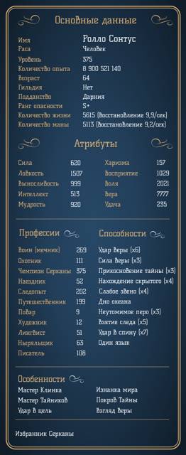 Огромный снежный барс, поджарый, пушистый, прекрасный в своей смертельной мощи и грациозности, взмыл в воздух. Стряхнуть его со следа, благодаря умениям Ролло, не удалось, на 400-м уровне барс получил Особенность «истинный Хищник», похоже позволявшую ему видеть сквозь уловки Скрытника. Бранд, хоть и видел название Особенности в Статусе барса, но описания к нему не прилагалось и оставалось только гадать, что именно она дает могучей зверюге.