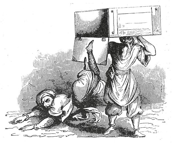 Цырюльник тотчас же вошел в дом, а я, увидав это, только и думал о том, как бы мне убежать от него; но, осмотревшись кругом, я не увидал нигде выхода и сел в большой сундук, почему-то стоявший тут в комнате. Засев в сундук, я закрыл его и сидел, притаив дыхание. Вслед за тем в эту самую комнату вбежал цирюльник; не глядя никуда, он прямо направился к сундуку, в котором я сидел. Затем он осмотрелся и, видя, что в комнате никого нет, поднял сундук себе на голову, причем я совершенно обезумел. Цирюльник быстро сбежал с сундуком: тут я убедился, что он ни за что не отстанет от меня и, отворив сундук, выскочил из него на землю. От этого прыжка у меня переломилась нога. Приблизившись кое-как к дверям, я нагнал там целую толпу народа. Никогда в жизни не видывал я такой толпы, какая собралась в этот день. Чтобы развлечь ее, я бросил в нее горсть золота, и пока народ подбирал червонцы, я проскользнул в другие улицы Багдада, преследуемый цирюльником, и куда бы я ни заходил, он заходил вслед за мною и кричал: