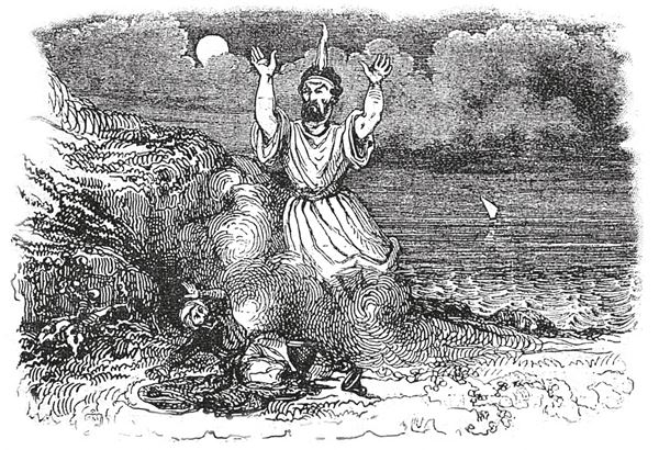 Говоря таким образом, он отбросил в сторону кувшин и встряхнул, и вычистил сети. Попросив прощения у Бога за свою досаду, он в третий раз вернулся к морю, забросил сеть и подождал, пока она не опустилась и вода не успокоилась. Он вытянул ее и нашел в ней множество обломков горшков и кувшинов.