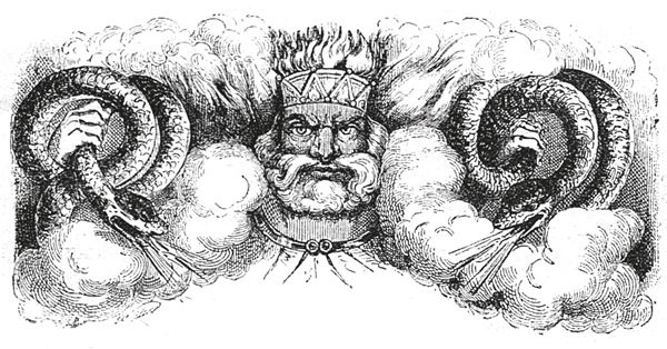 Оно достал нож и ковырял свинец до тех пор, пока не вытащил его из горлышка. Затем положил графин на землю и встряхнул его, для того чтобы содержимое вылилось из него, но из графина пошел сначала пар, поднявшийся до самых небес и разостлавшийся по земле, что немало удивило его. Спустя некоторое время пар стал сгущаться, трепетать и обратился в Шайтана, голова которого касалась облаков, в то время как ноги его еще стояли на земле. Голова его походила на купол, руки – на вилы, а ноги – на мачты. Рот его походил на пещеру, зубы были точно камни, ноздри как трубы, а глаза как лампы; волосы пыльного цвета висели распущенными.