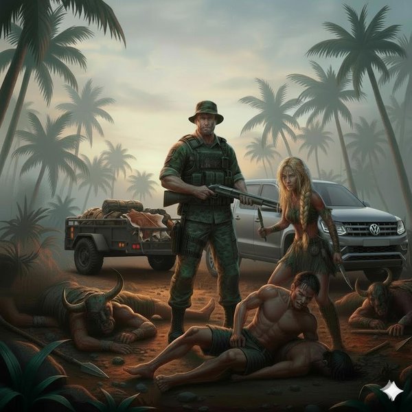 И тут из леса показались «Быки»! Они шли в полном составе! Кто-то хромал, кто-то ковылял, но все они были вооружены каменными топорами и копьями. По всей видимости, «Быки» ничего лучше не придумали, как пойти по нашему следу, благо, что «Амарок» оставлял след, который даже не следопыт разберёт. И они шли нам мстить. И вот такое несчастье, что я пробил колесо, и они как раз в этот момент нас и настигли.
