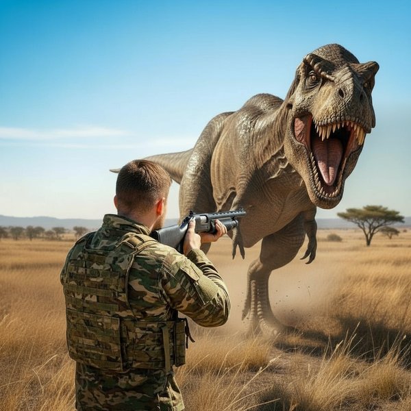 Спуск. БА-БАХ! Первая пуля ушла в грудь – я увидел вспышку, почувствовал резкий толчок в плечо, услышал хлёсткий шлепок в плоть, – но тираннозавр даже не запнулся. Его туша просто двинулась вперёд, сокращая дистанцию; воздух задрожал от топота. Паника сдавила грудь стальным обручем – дышать нечем, а руки дрожат так, что прицел плывёт. Ужас липкий, животный, заставляет желудок сжиматься в комок. Я сжимаю помповик, пальцы белеют на цевье, ногти впиваются в ладони.