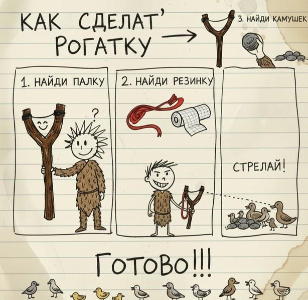 – «Ну что ж! Я научу вас! Не только рыбу ловить, как вы уже научились, но и охотиться на «Водных Птиц»! И на других птиц, которых можно есть! Но для этого нам нужно освоить новое оружие. Оно называется «Рогатка»!» и я сделал мхатовскую паузу.