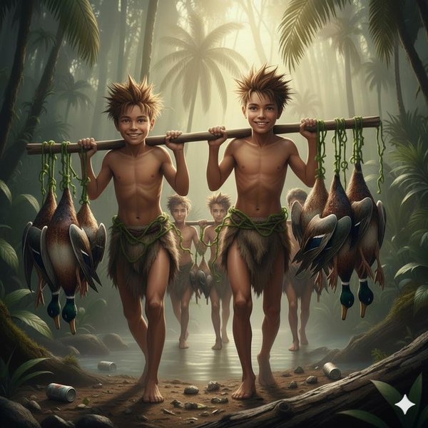 Я быстро распределил обязанности своей молодежной команды подаванов. Часть своей девичьей команды Хранительниц Храма Дыма я отправил в лес за ягодами. Остальным девчатам, сказал продолжать коптить рыбу в прок. Сегодня еще наши ребята-рыбаки принесут. Ребят под предводительством Зуба отправил с удочками на берег в качестве диверсификации – к вечеру наловить рыбы если не сложится ситуация половить «Сетью» с охотниками, так чтобы была еда для гостей на первое время. А сам с парнишками-рогаточниками отправился в то самое место, где, по их словам, скапливалось огромное количество уток. Ан уверенно шел проводником вперед в глубь джунглей. Я прихватил с собой помимо оружия еще топор, пачку гвоздей и весло от своей лодки. «На всякий случай! Чтобы потом не бегать туда-сюда!»