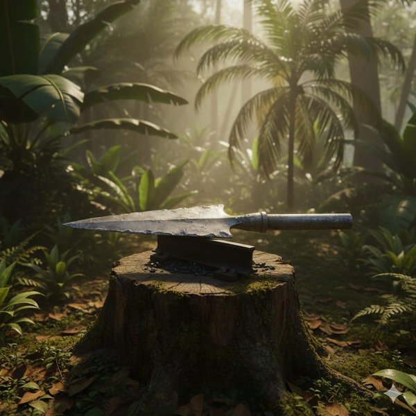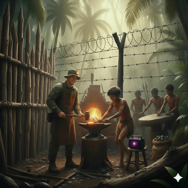 «Ёжки-матрёшки, да это же просто универсальные солдаты, мои молодые подаваны! И рыбу ловят, и на уток охотятся, и мне тут, можно сказать, «завод» строят!» Ребята помогли мне сложить очаг, который стал настоящим кузнечным горном. Я подвёл к нему по трубке воздух от компрессора – получился отличный поддув! На большую колоду я насадил кусок рельсы, который у меня был, – вот и наковальня готова!