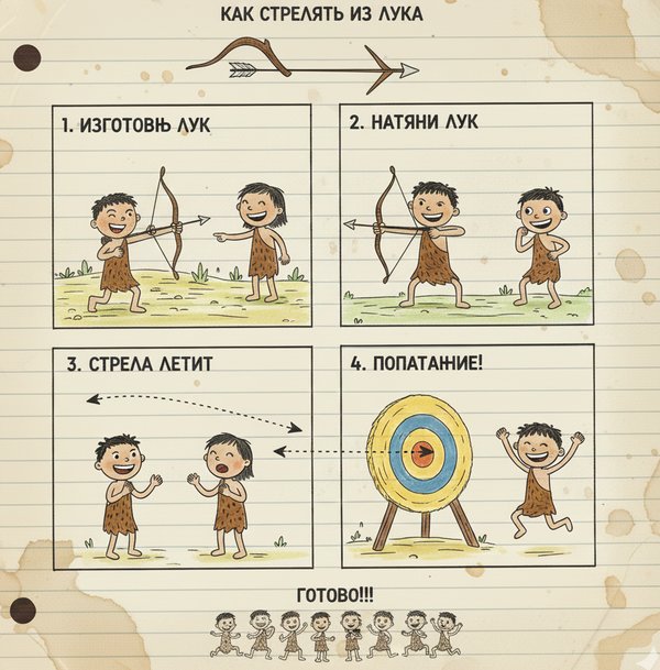 Я выкроил немного времени и потренировал Баара и Юла стрелять из лука. Сначала ребята немного тупили и неуклюже держали лук и стрелы. Я тогда воспользовался уже привычным приемом. Нарисовал в Дневнике Инструкцию с человечками, как стрелять из лука. И ежики моченые, этот рисунок аборигенами был принят как заклинание[T1], и они сразу начали быстро учиться. Ребята были молодые еще, поэтому науку схватывали влет.