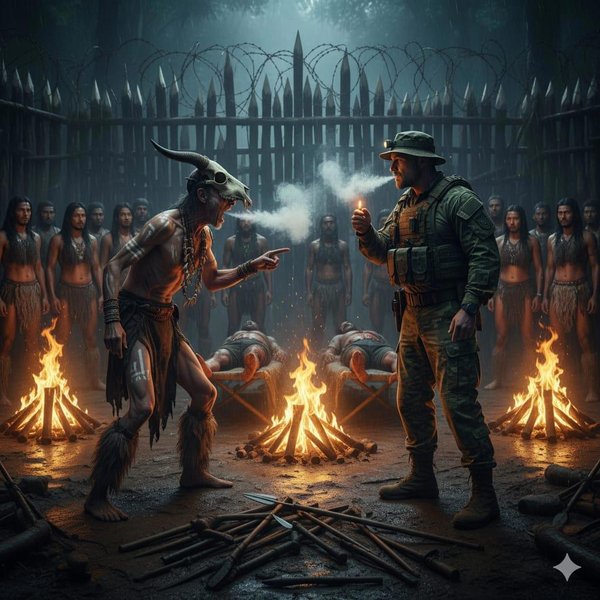 Народ затих, наблюдая за нашей немой дуэлью. Старый Шаман замер, его глаза расширились от удивления, когда он увидел такое количество дыма от очень маленького моего «Шаманского амулета». Он явно не ожидал такого ответа.