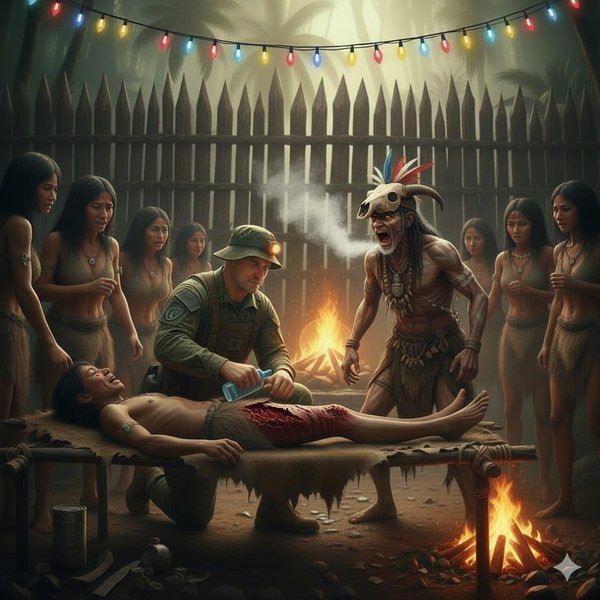 Я пока оставил на несколько минут женщин и молодых ребят из моей «группы поддержки» – приказав подготовить раненых к перевязке и чистке ран, убрать все лишнюю одежду и вокруг ран вымыть меховой мочалкой тело от грязи, но так чтобы в рану ни капли не попало! Говоря это я строго всем погрозил пальцем. Они прониклись. Сам же зашёл в свой «Амарок», покопался там в коробке с новогодними игрушками (кстати еще товар для аборигенов!) и достал одну из «гирлянд» – ту самую, маленькую новогоднюю ёлочную гирлянду на батарейках, которую я покупал для пластмассовой ёлочки, что ставил на журнальном столике в своей фотостудии.