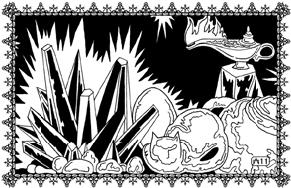 Камень и в самом деле был необыкновенным. Более всего он напоминал каменного ежа. Грани сросшихся кристаллов играли сиреневым светом, в глубине вспыхивали синие искры. Не успел магрибинец произнести ни слова, как Аладдин уже поднял это чудо и стал вертеть его в руках. От прикосновений пальцев по камню пробегали странные огни. Кроме того, камень словно беззвучно пел.