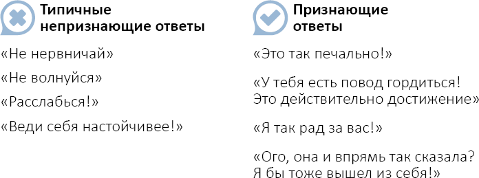 Оба ли ответа возымеют должную реакцию? Отнюдь. Первый ответ – не что иное, как игнорирование чувств собеседника: вы просто отмахиваетесь от его переживаний. Этот ответ – непризнающий. Напротив, во втором ответе вы признаете чувства собеседника («Я тебя понимаю») и оправдываете их («Выпускной экзамен – это сложно!»). Вы на его стороне. Это признающий ответ.