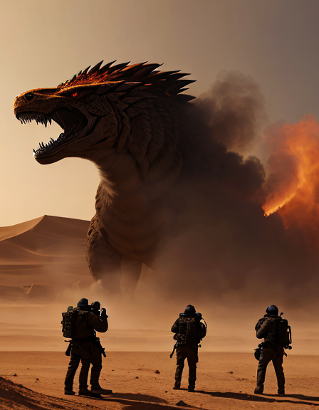 Сквозь огонь и дым, что вздымались над пустыней, было сложно что-то разглядеть. Но минуты через три, дым разошелся, и мы все смогли рассмотреть нового гостя.