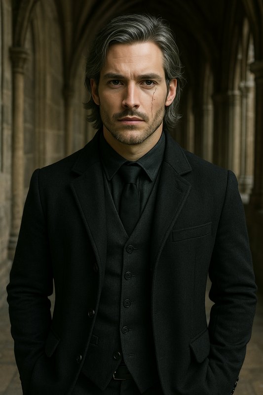 Лицо суровое, резкое, со шрамом, тянущимся от виска к уголку губы и задевающим край глаза. Из-за него выражение становилось особенно хмурым и настороженным.