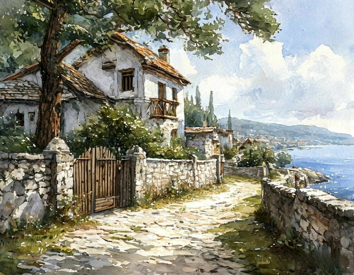 Дом из серого камня, в окружении высокого забора из камня того же цвета. Небольшая калитка со стороны дороги, покрытой крупными серыми плитами. На холм, перпендикулярно от дороги, вдоль забора тянулась узкая дорожка отсыпанная мелким щебнем, укатанная десятилетиями до состояния асфальта. Видны были ворота на задний двор. И пологие холмы вокруг, покрытые виноградниками. Вася открыла ключом калитку. Мощеный камнем двор, по периметру клумбы с цветами. Большая терраса, крытая черепицей, со столиком, и рядом четыре стула. Три вековые сосны, неохватной толщины, давали достаточно тени.