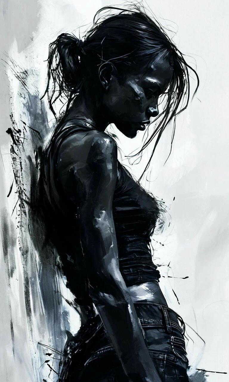 Картина получилась странной, на ней был предмет разговора – женщина. А так как думы были в черном ключе, что и женщина была черная. Но не в смысле негритянка, она была густо затенена черным мелом. Девушка в джинсах и коротком топе, устало прислонилась к белой стене. Получилось жестко, грубо, эмоционально. Здесь, так ни кто не рисовал. Ден закончил и задумчиво вытирал руки, находясь в своей внутренней Монголии. Шаги Ани услышал давно, но тело не чувствовало опасности, и не выходило из транса.