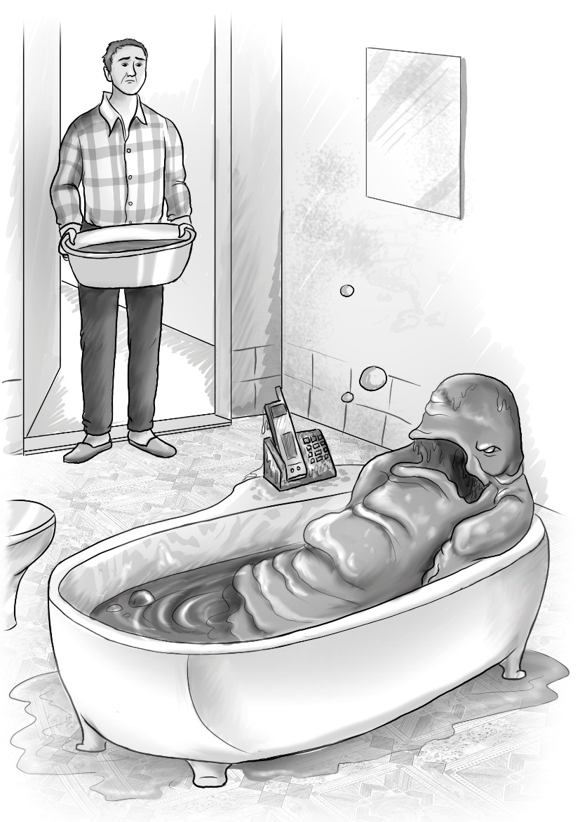 Жена, не веря своим глазам, наклонилась над очком отхожего места. Гриб молчал. Тогда она вооружилась стоящим возле унитаза вантузом и хотела было ударить им гриб, как тот вдруг легко и неожиданно выпрыгнул из унитаза и налип на её раскрасневшееся после косметической маски лицо. Фирзякин услышал дикий, заглушенный телом гриба рык. Жена, пытаясь содрать атаковавшую её нечисть, сучила по лицу когтями. Но все было тщетно. Гриб словно прирос к ней. Края его сомкнулись на затылке намертво. Несчастная, вертясь юлой, в агонии выскочила в коридор, налетела на рогатину вешалки и упала на пол. Спустя минуту она затихла, и Фирзякин понял, что произошло страшное.
