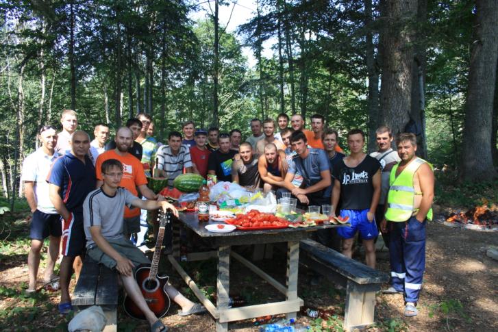 Позже большая часть вахтовиков побежали на канатку с целью уехать в город отдохнуть, мы же остались нам на костре было вполне весело, тем более на нас оставили около 10 кг шашлыка и пару арбузов… Помню смеялись, кушали до пуза, фотографировались.