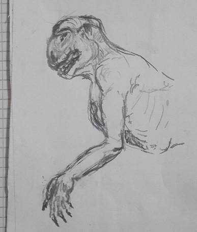 Старого знакомца я увидел еще через два дня. Теперь он не просто похож на лягушку переростка – он огромная толстая жаба. Веса в нем килограмм триста. Вся спина, или правильнее сказать, верхняя поверхность тела в наростах. Жрал он, отрывая от жертвы крупные куски тела, проглатывая их целиком. Под конец от жертвы осталась только верхняя часть черепа, раздавленная в лепешку.