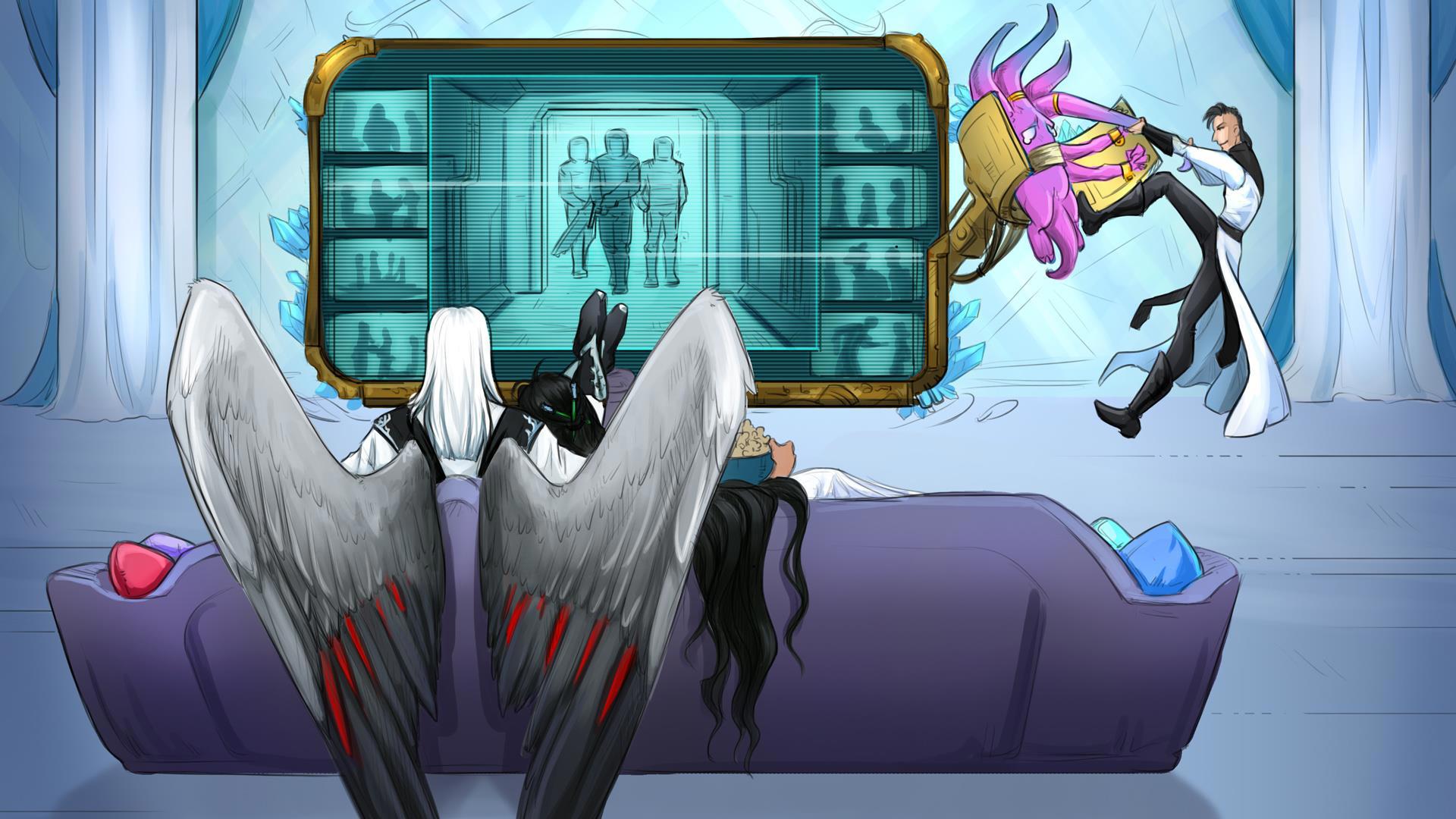 Покои нам достались ровно те же, что и раньше. Так что, проходя мимо помещения, где мы встречались с Кассиопеей, с любопытством обнаружили, что явно покорёженные недавно взрывом двери всё еще не были заменены...
