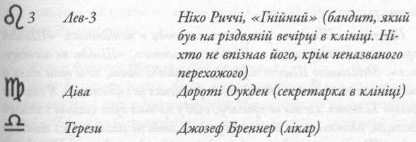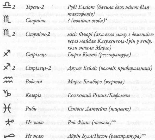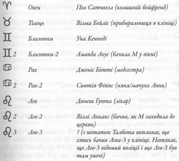 У нотатнику немає імен, тільки символи зодіаку. Я не став шукати безіменних свідків, оскільки ми все одно не зрозуміємо, хто вони, маючи тільки їхні зодіакальні знаки. Але після перевірки всіх прямих доказів я гадаю, що Талбот вважав важливими фігурами в розслідуванні таких людей: