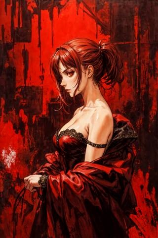 Любой мужчина испытал бы панический ужас от этого взгляда, принадлежащего до неприличия красивой женщине. Каждая чёрточка её лица казалась совершенной под стать её кровавому образу. У неё были собранные в конский хвост ярко-красные густые волосы, острые изящные брови и алые губки с выглядывающими клыками.