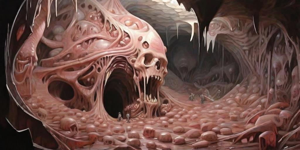 Кое-как откашлявшись от питательной жидкости, я огляделся вокруг и увидел такие же стены и потолок из плоти, покрытые костями и хитином, которые усиливали конструкцию, а позади себя увидел что-то вроде капсулы из плоти, которая торчала из стены биомассы, утыканная венами и прочими природными "шлангами".