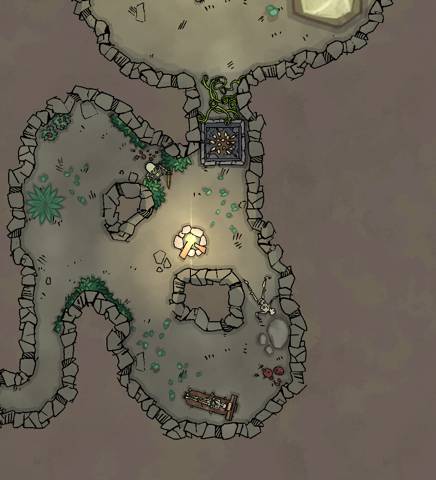Охотник вошел в комнату и пошел за первый сталактит, рыцарь запалил свой факел и пошел в другую сторону исследовать комнату.