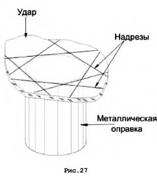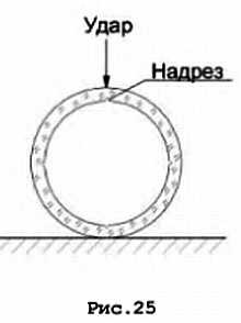 Если в колбу необходимо впаять торцовое окно, то можно пойти двумя путями: Из той же трубки, из которой сделана колба, отрезать обечайку нужной длины, сделать на её внутренней стороне продольные надрезы стеклодувным ножом и очень лёгким и коротким ударом по её наружной поверхности разбить по надрезам. (Наблюдаем за тем, чтобы удар приводил к возникновению напряжений растяжения и разрыву стекла в месте надреза – общее правило при резке стекла по надрезу) (см. рис. 25).