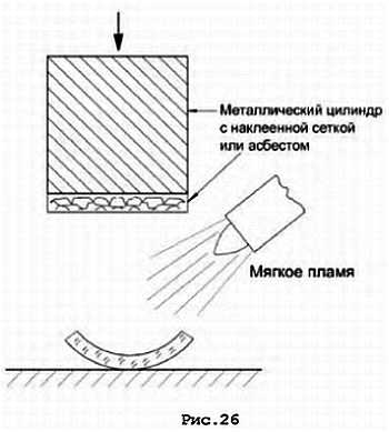Полученные куски стекла необходимо выправить до плоскости. Это делается следующим способом: на подходящий кусочек слюды, асбеста или ровной сетки из нержавейки укладываем стекло, нагреваем его мягким пламенем до размягчения и прижимаем кусочком обугленного дерева, графита или наклеенной на алюминиевую подложку с помощью силиконового клея сеткой (см. рис. 26), повторив эту операцию, получаем более-менее ровный кусок стекла – заготовку для будущего окна. На этой операции нет смысла стремиться к абсолютной плоскостности заготовки, она может быть легко достигнута при последующих операциях.