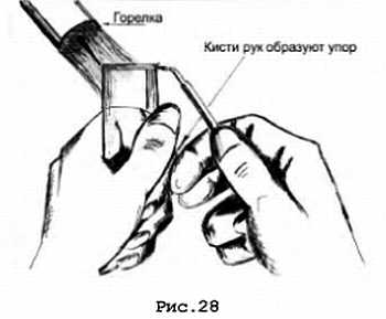 Изготовленное тем или другим способом окно следует припаивать к прошлифованному на планшайбе не очень крупным абразивом торцу трубки. Если само окно очень ровное (полученное шлифовкой), то уложив его на торец трубки и отцентровав, прогреваем его в специальной печи или, если это пирекс и молибденовое стекло диаметром не более 40 мм, на мягком и не горячем пламени горелки до жёлтого свечения пламени, а затем провариваем шов пламенем микрогорелки, работающей на гремучем газе в несколько проходов. Её мощность следует выбирать не очень большой. Окна из бактерицидного стекла можно паять к трубкам из «зелёнки» до диаметра 26 мм. Греть следует не центр окна, а его края (см. рис. 28).