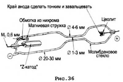Гейслерова трубка из молибденового стекла с железным катодом из материала консервной банки, отожжённом в водороде и окисленным прогревом в пламени с последующим охлаждением на воздухе. Она снабжается анодом в виде железного цилиндрика, в котором проволочным кольцом укреплена таблетка из цеолита. Род цеолита не играет особой роли, но он не должен быть загрязнён органикой. Наверняка вместо него можно применять алюмогель или силикагель, но мы работали только с цеолитом, что было вызвано исключительно его наличием, возможностью изготавливать из него аккуратные таблетки с помощью напильника или наждачной бумаги и термостойкостью, позволяющей очищать его кратковременным нагревом анода до слабого свечения. Объём таблетки в 20 мм3 вполне достаточный.