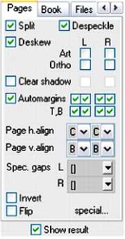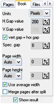 На закладке Book выставляем размеры выходных страниц, оставляем Page width и height в Auto. В поле H.Gap value ставим 200 (или 250) pixels, это значение обычно для обработки в 600 дпи, но если Вам хочется других размеров полей, то можете подобрать это значение по своему вкусу.