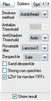 Во вкладке Options, ставим Deskew method = Auot(shear), для Despeckle метод Safe или Fine+Normal это интеллектуальный метод очистки. Например, он не вычищает точки над i и j.