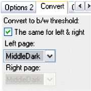 Вкладка Convert – выставляем порог для преобразования из градаций серого в черно-белый. Для Convert to b/w threshold выбираем MiddleDark. He забываем удерживать Ctrl при выборе опции, предназначенной для всех страниц. Но никто не мешает провести эксперимент для своего скана и выбрать другой параметр.