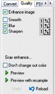 Ну, наконец, последняя, но очень важная вкладка Quality. В Enhance image ставим галочки для Blur и Sharpen, значения для них обычно 1 или 2 (набор этих опций и их значения не догма, можете поэкспериментировать, но для начала поставьте как на рисунке), для 2 результат будет пожирнее, выбирайте исходя из шрифта, сканируемой книги.