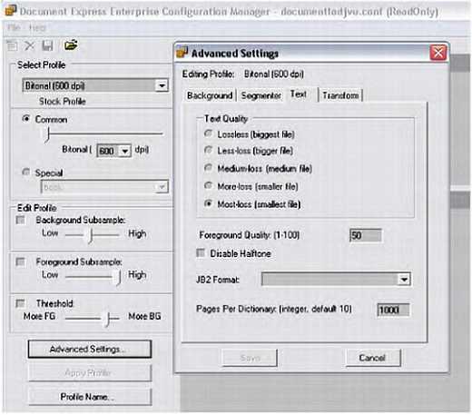 Второй, рекомендованный способ, это использовать Document Express Enterprise 5.1 (доступна облегченная версия этого пакета, объемом около 20 мегабайт). Вначале создаем профиль для кодирования (делается это не часто, можно один раз), для этого запускаем Document Express Enterprise Configuration Manager из этого же пакета, из списка выбираем профиль Bitonal(600), нажимаем на кнопку Advanced Settings…, в диалоговом окне Advanced Settings выбираем закладку Text и ставим Pages Per Dictionary равным 1000 (конечно, это небольшой экстремизм, можно ограничиться значением 100…200). Сохраняем этот профиль под новым именем. Увеличение размера страниц на словарь, приводит к заметному уменьшению размера файла, до 25 %.