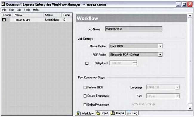 Запускаем Document Express Enterprise Workflow Manager, загружаем все страницы зараз, в поле Job Name пишем название книги, из списка Raster Profile выбираем, подготовленный ранее профиль, переключаемся на закладку Output и из списка Separate Document(s) by выбираем One document only. Ставим галочку (с самого левого края под Enable) и ждем конца кодирования, следим или пока эта галка исчезнет или по закладке Log.