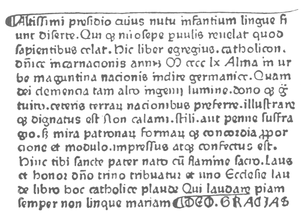 Первою книгою, отпечатанною изобретенным тайным искусством, считается «Латинская грамматика» Элия Доната. Несколько листов ее дошли до наших дней и хранятся в Национальной библиотеке в Париже.