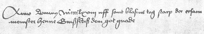 Запись о смерти Иоганна Гутенберга. «MCDLXVIII uff sant blasius tag starp der ersam mainster Henne Ginssfleiss dem got gnade», что означает «В 1468 г. в день святого Власия умер почтенный мастер Хенне Гинсфляйс милостью божией»