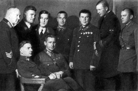 Руководство ВВС на приеме у К. Е. Ворошилова. Рядом с Ворошиловым сидит Я. И. Алкснис – командующий ВВС РККА. 1936 год