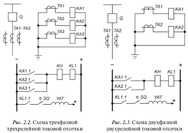 2.1.2. Схемы токовых отсечекОтсечки, выполненные по трехфазной трехрелейной схеме(рис. 2.2), применяются для защиты электрических сетей напряжением 110 кВ и выше (сетей с глухозаземленной нейтралью). Трансформаторы тока устанавливаются в каждой из трех фаз контролируемой сети. Вторичные обмотки ТТ и катушки токовых реле соединяют по схеме «звезда/звезда» (Y/Y); при этом в нормальном режиме токи в реле равны вторичным токам ТТ, то есть k CX= 1.