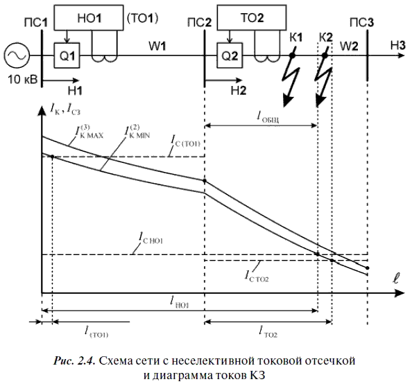 Если в исходном состоянии электрической сети КЗ произошло вне общей зоны действия защит l ОБЩ, но в зоне действия l TO2токовой отсечки ТО2 (точка К3), то под действием этой защиты будет быстро отключена только линия W2. Неселективная отсечка НО1 действовать не должна, и линия W1 остается во включенном состоянии.