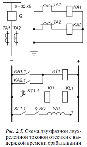 Схема токовой отсечки с выдержкой времени приведена на рис. 2.5. Требуемая выдержка времени неселективной отсечки создается при помощи реле времени KT1.