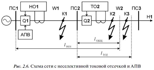 При КЗ на линии W1 (точка К1) под действием неселективной отсечки НО1 будет отключена линия W1. Устройство АПВ повторно включит линию, и, если КЗ оказалось устойчивым (не ликвидировалось за время действия АПВ), неселективная отсечка НО1 вновь отключит линию W1. Количество включений линии W1 (обычно одно) ограничивается устройством АПВ.