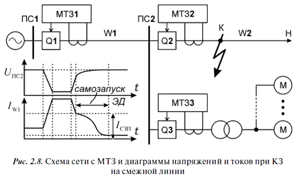 Так, при КЗ в начале линии W2 (рис. 2.8) токи в местах установки защит МТЗ1 и МТЗ2 увеличиваются, токовые реле этих защит срабатывают и реле времени начинают отсчет установленных на них выдержек времени. Одновременно снижается напряжение на шинах подстанции ПС2 и двигатели М, также питающиеся от шин этой подстанции, затормаживаются. Часть из них при этом отключается, другая часть в соответствии с технологическими требованиями остается подключенной к сети. После отключения линии W2 защитой МТЗ2 начинается процесс самозапуска этих двигателей, при котором ток в месте установки МТЗ1 равен току самозапуска электродвигателей. В этих условиях необходимо, чтобы МТЗ1 все же вернулась в исходное состояние, прервав отсчет времени.