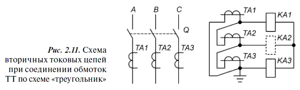 Треугольник(обмотки реле соединяются по схеме звезды, а вторичные обмотки трансформаторов тока – по схеме треугольника, рис. 2.11; k CX= √3; схема оперативного тока такая же, как для полной звезды – см. рис. 2.9) используется для защиты трансформаторов 35 кВ и выше.